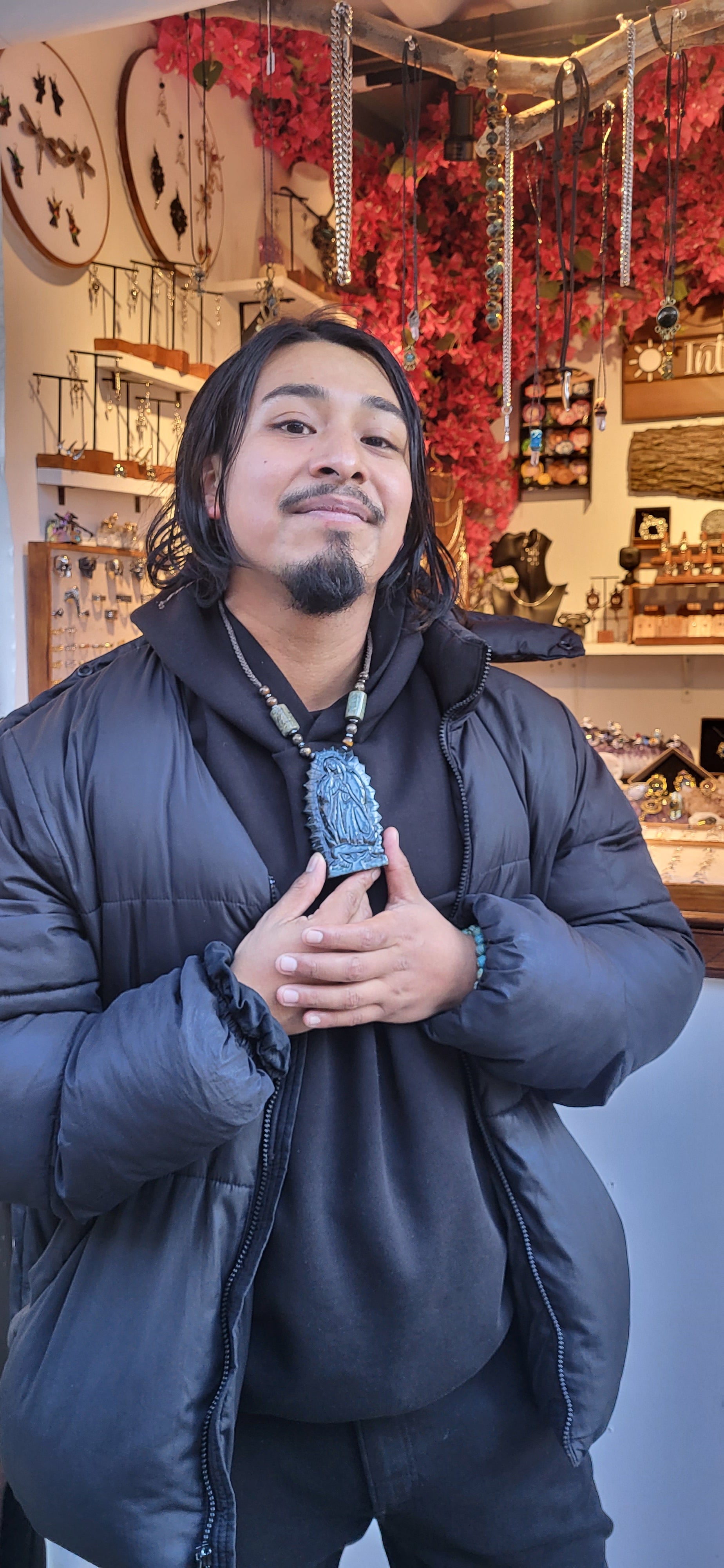 This Virgen de Guadalupe necklace was a custom order for a customer at the Columbus Circle Holiday Market. He was so happy with his personalized piece!
